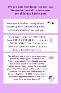IF YOU AGREE, keep your child/children home FRIDAY SEPTEMBER 3, 2021, which is WCSD COUNT DAY. The higher the number of children at school, the more money the district receives.