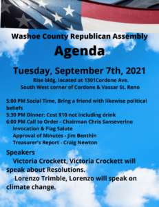 « All Events This event has passed. Washoe County Republican Assembly September 7, 2021 @ 5:00 pm - 8:00 pm « Freedom of Choice RENO-Shut Down America CARSON CITY WASHOE PATRIOTS MEETING » Add to calendar Google Calendar iCalendar Outlook 365 Outlook Live Details Date: September 7, 2021 Time: 5:00 pm - 8:00 pm Website: https://wcranv.com/